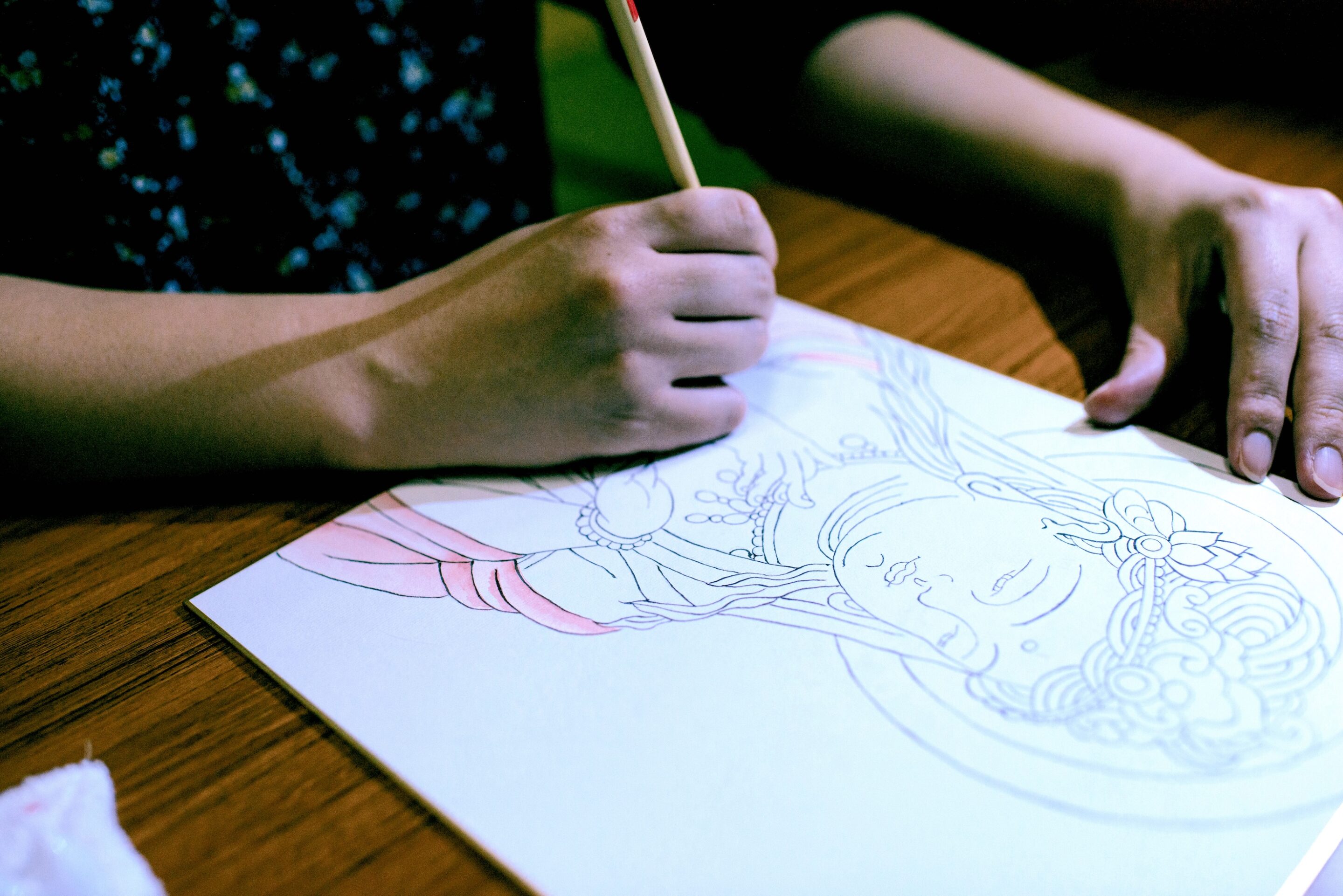 『古典仏画の複製模写』受講者のペースに合わせて『古典仏画の複製模写』を学びながら実際に仏画を描いていく講座です。絵写経を通して仏画に興味が出てきた方や初めての方、経験者も一緒に順を追って各人の描きたい仏画が描けるように手ほどきいたします。