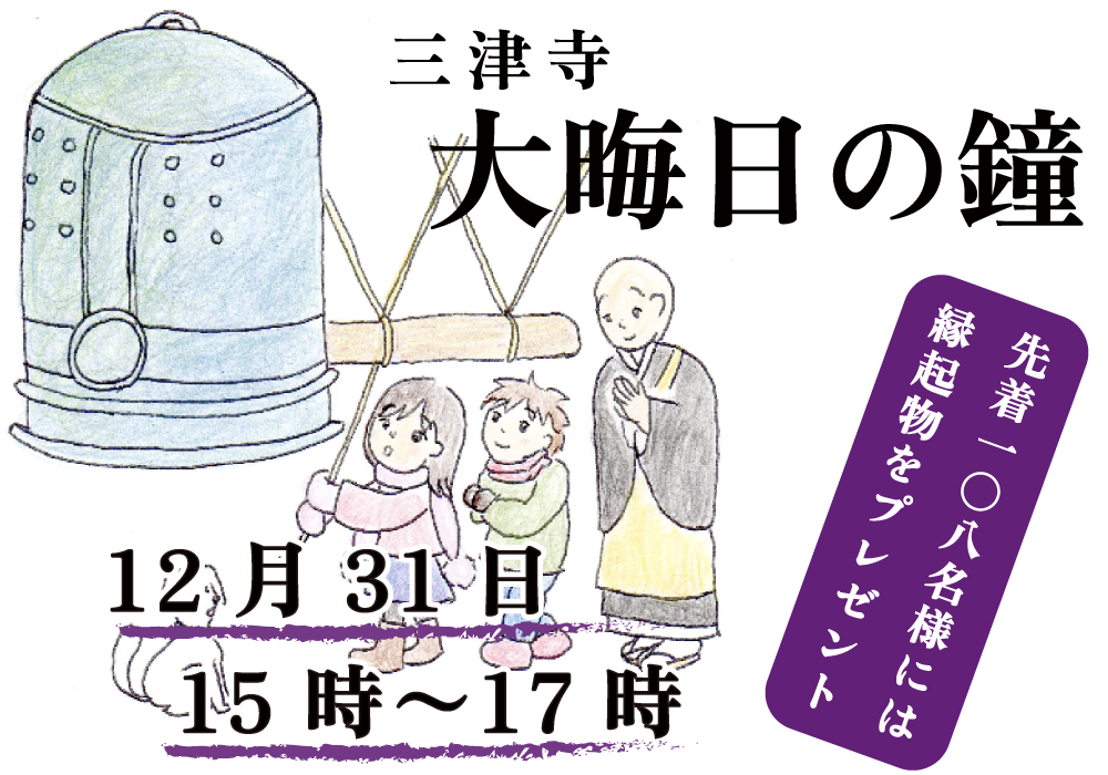 アーティストコラボ 三津寺の授与品三津寺にて販売中 三津寺で絵写経体験 吉祥宝来を作るワークショップ 三津寺 大晦日の鐘先着108名さまには縁起物をプレゼント 12月31日 15:00–17:00 新年ご祈祷大般若転読会 2025年1月3日(金)14時–、15時–、16時–